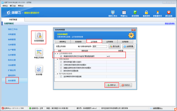 在功能導(dǎo)航窗點(diǎn)擊“系統(tǒng)管理”—》“系統(tǒng)參數(shù)配置”—》“業(yè)務(wù)參數(shù)”打開業(yè)務(wù)參數(shù)配置界面,在“業(yè)務(wù)單據(jù)相關(guān)參數(shù)”內(nèi)啟用參數(shù)“單據(jù)保存附件資料文件名的擴(kuò)展信息數(shù)據(jù)項(xiàng)”,并設(shè)置參數(shù)值,默認(rèn)是“ext1”(單據(jù)主體.擴(kuò)展信息1)。