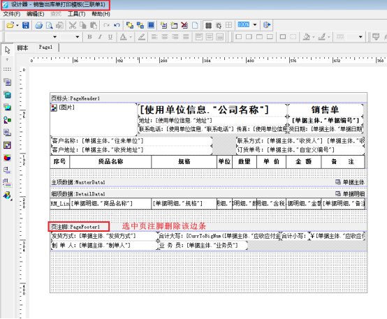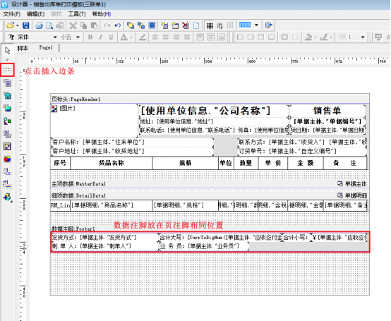 導(dǎo)航欄選擇“業(yè)務(wù)處理”—》“新開訂單”—》打印—》打印格式設(shè)計—》設(shè)計格式,進入打印模板的設(shè)計器界面,選中“頁注腳”刪除該邊條,在該位置添加數(shù)據(jù)注腳,如下圖所示: