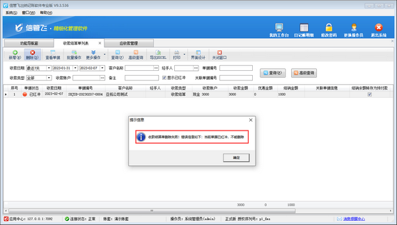 參數(shù)設(shè)置完成后,重新打開(kāi)收款結(jié)算單列表界面,對(duì)剛剛“已紅沖”的收款結(jié)算單進(jìn)行刪除,此時(shí)就可以刪除成功了,如下圖所示: