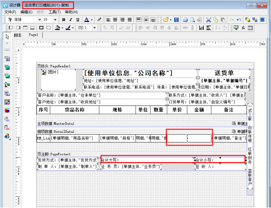 用戶(hù)需要打印一份一樣的無(wú)價(jià)格的模板,在銷(xiāo)售出庫(kù)單界面點(diǎn)擊打印下的“打印格式設(shè)計(jì)”,在打印格式設(shè)計(jì)界面,點(diǎn)擊“送貨單打印模板(B01)”,工具欄點(diǎn)擊“復(fù)制”,會(huì)生成一個(gè)“送貨單打印模版(B01)-復(fù)制”的模板,選擇此模板點(diǎn)擊“設(shè)計(jì)格式”,設(shè)計(jì)器界面刪除單價(jià)金額對(duì)應(yīng)的明細(xì)列調(diào)用數(shù)據(jù)項(xiàng),保存模板預(yù)覽可看到單價(jià)金額處為空顯示。如下圖所示: