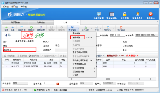 無(wú)定金的訂單,已審核已完成狀態(tài)的訂單可直接打開(kāi),在更多操作下點(diǎn)擊“紅沖單據(jù)”,先紅沖作廢,然后再點(diǎn)擊“刪除單據(jù)”可以直接刪除成功,如下圖所示: