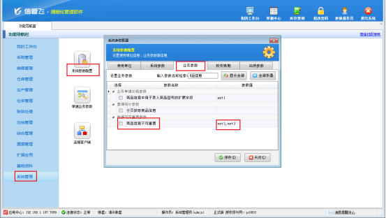 功能導(dǎo)航窗點擊“系統(tǒng)管理”-》“系統(tǒng)參數(shù)配置”-》“業(yè)務(wù)參數(shù)”打開業(yè)務(wù)參數(shù)配置界面,數(shù)據(jù)可否重復(fù)參數(shù)下取消勾選參數(shù)“商品信息不可重復(fù)”,勾選之后點擊保存,如圖所示: