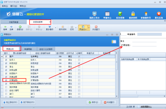 參數設置完成后,功能導航窗點擊“往來管理”—“應收款管理”,選擇未結銷的應收款記錄,點擊“收款結算”進入收款結算單界面。收款結算單打開“界面設計”,單據主體中勾選顯示擴展信息1,移動到合適位置后保存界面設計,然后正常結算,結算單保存后對應的應收款的記錄的銷售單單據編號會自動提取到擴展信息1中,如下圖所示: