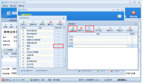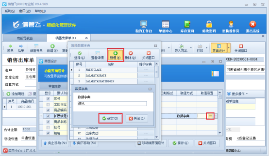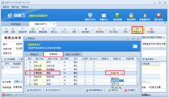 在功能導(dǎo)航欄點擊銷售管理---打開銷售出庫單,在開單界面點擊界面設(shè)計,勾選擴展信息并自定義列名為“顏色”,取值方式選擇“數(shù)據(jù)字典”,如圖所示:
