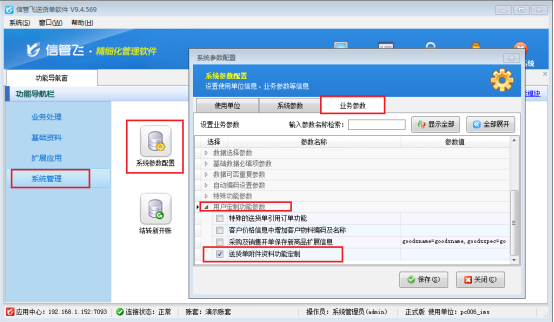 在功能導(dǎo)航窗點(diǎn)擊“系統(tǒng)管理”----“系統(tǒng)參數(shù)配置”----“業(yè)務(wù)參數(shù)”勾選送貨單附件資料功能定制,保存設(shè)置。如下圖所示: