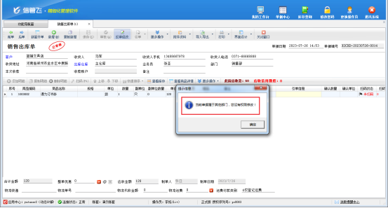 點擊“銷售管理”-》“銷售出庫單”,打開一個已開銷售單,反審修改單據,出現以下提示: