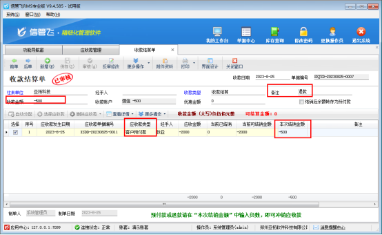 功能導(dǎo)航窗點(diǎn)擊往來管理—》應(yīng)收款管理,選擇客戶預(yù)付款,點(diǎn)擊工具欄收款結(jié)算,在收款結(jié)算單界面。收款金額和當(dāng)前可結(jié)銷金額輸入-500,可備注下退款,保存審核結(jié)算單就可以,如下圖所示: