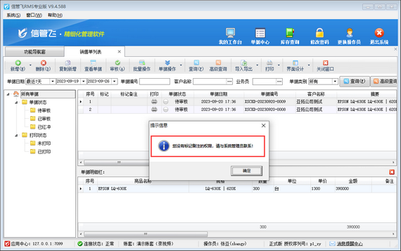 信管飛RMS支持對(duì)銷售單列表、采購單列表、銷售訂單列表以及采購訂單列表等標(biāo)記備注,有用戶在標(biāo)記單據(jù)備注時(shí)無法標(biāo)記,系統(tǒng)彈出提示信息“您沒有標(biāo)記備注的權(quán)限,請(qǐng)與系統(tǒng)管理員聯(lián)系!”如下圖所示: