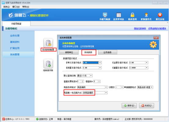 首先設(shè)置商品唯一性匹配方式,在功能導(dǎo)航窗點(diǎn)擊“系統(tǒng)管理”—“系統(tǒng)參數(shù)配置”,選擇系統(tǒng)參數(shù)打開,商品唯一性匹配方式中選擇“商品編碼”,保存參數(shù)配置,如下圖所示: