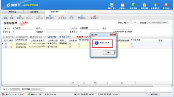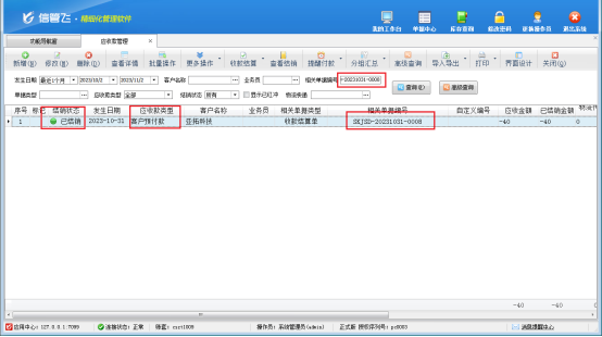然后,選中此已結銷的客戶預付款記錄,在工具欄點擊“查看結銷”—》“查看結算單”,打開此客戶預付款的結銷記錄,更多操作下將此客戶預付款結銷記錄先紅沖后刪除,此時單據(jù)編號為“SKJSD-20231031-0008”的收款結算單即可反審修改成功,如下圖所示。