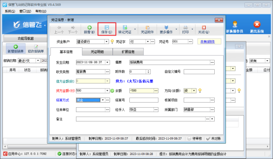 在轉記憑證界面需要錄入資金賬戶、摘要、收支類別、結算方式等憑證信息,然后點擊保存按鈕,如圖所示:
