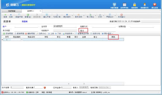 功能導(dǎo)航欄點擊“業(yè)務(wù)處理”—》“新開送貨單”,進(jìn)行送貨單開單界面,此時的界面是軟件默認(rèn)開單界面,點擊工具欄“界面設(shè)計”按鈕,進(jìn)入界面設(shè)計窗口,如圖所示。