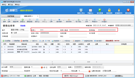 使用操作員賬號重新登錄軟件,可查看單據主體客戶收貨人、電話、地址等信息,如圖所示: