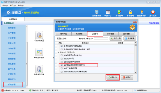 出現此問題的原因是:當前登錄的操作員沒有查看客戶基礎資料權限,解決方法如下:使用系統管理員賬號登錄軟件,在功能導航窗點擊“系統管理”—》“系統參數配置”—》“業務參數”勾選參數“啟用基礎資料數據項權限控制”,如圖所示:
