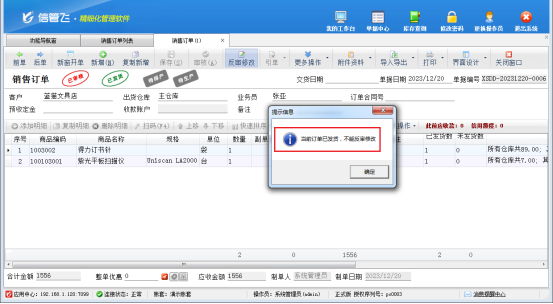 信管飛RMS軟件支持對銷售訂單進行反審修改、紅沖操作,部分用戶在修改已發貨訂單時可能會出現“當前訂單已發貨,不能反審修改”的提示,本篇文章以“信管飛RMS軟件”為例介紹下已發貨訂單無法修改如何解決?