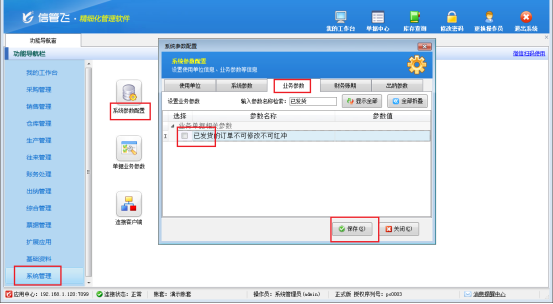 在功能導航窗點擊“系統管理”—》“系統參數配置”—》“業務參數”可以打開“業務參數”配置界面,在業務單據相關參數內取消勾選“已發貨的訂單不可修改不可紅沖”參數,然后點擊“保存”按鈕保存設置,如圖所示。
