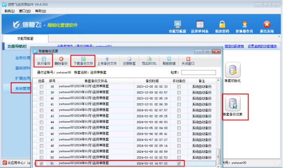 云賬套版本初始化后會清除之前所有數(shù)據(jù),需要初始化前保留之前備份數(shù)據(jù),可以在系統(tǒng)管理—“賬套備份還原”中,先手動執(zhí)行備份,備份執(zhí)行完成后選擇備份文件點擊“下載備份文件”到本地,如下圖所示: