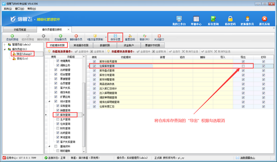 在功能導航窗點擊“系統管理”—》“操作員及授權”打開操作員管理及授權界面,選擇操作員“張亞”,然后在其右側的功能模塊權限內選擇“庫存查詢”,將倉庫庫存查詢的“導出”權限勾選取消,然后保存權限設置,如下圖所示。