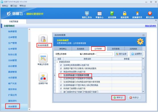功能導航窗點擊“系統管理”“系統參數配置”,打開“業務參數”,在數據選擇參數中取消勾選參數“在選擇商品窗口可查看庫存數量”,保存參數配置,如下圖所示: