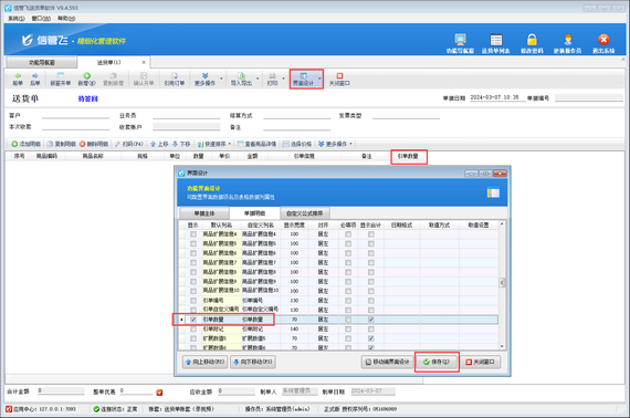 在功能導航窗點擊“業(yè)務(wù)處理”—》“新開送貨單”打開送貨單界面,然后在工具欄點擊界面設(shè)計,單據(jù)明細內(nèi)找到“引單數(shù)量”數(shù)據(jù)項,并設(shè)置顯示出來,如下圖所示。