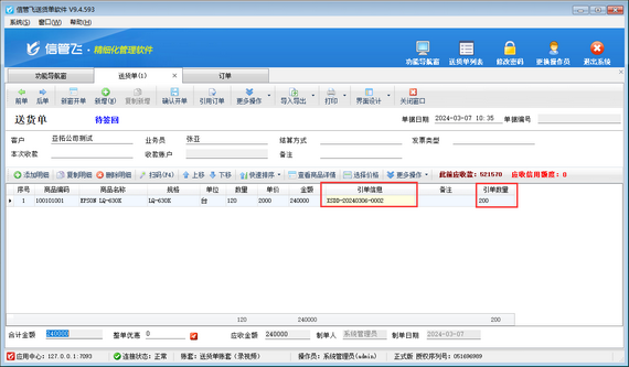 設(shè)置完成后,填開送貨單引用訂單開單時,會自動調(diào)取訂單數(shù)量到送貨單“引單數(shù)量”內(nèi),如下圖所示。