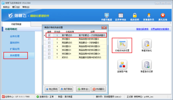 操作步驟:系統(tǒng)管理-----價(jià)格優(yōu)先級(jí)設(shè)置,把預(yù)設(shè)售價(jià)設(shè)置為第1優(yōu)先級(jí),開(kāi)單選擇商品時(shí),單價(jià)獲取的是商品信息中已設(shè)置好的預(yù)設(shè)售價(jià),如圖所示: