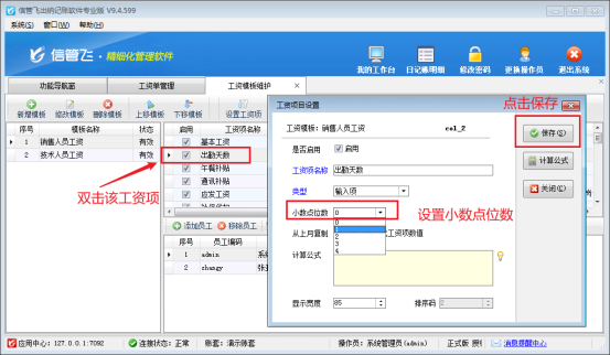 在功能導(dǎo)航窗點(diǎn)擊“綜合管理”—》“工資模板維護(hù)”,在工資模板維護(hù)界面,找到無法輸入小數(shù)位數(shù)的工資項(xiàng)“出勤天數(shù)”,雙擊該工資項(xiàng),打開工資項(xiàng)目設(shè)置,設(shè)置該工資項(xiàng)的小數(shù)點(diǎn)位數(shù),如下圖所示。
