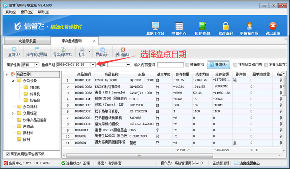 庫存盤點查詢功能則是信管飛RMS的另一大亮點。通過設定盤點日期,系統能夠快速生成指定日期之前的庫存情況報告,包括庫存數量、成本均價、庫存金額等詳細信息。這不僅簡化了盤點流程,提高了盤點效率,還能確保庫存數據的準確性和完整性。
