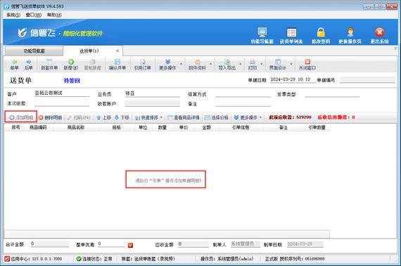 設置完成后,重新填開送貨單時,即可點擊“添加明細”按鈕直接添加明細,如下圖所示。