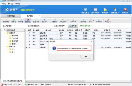 信管飛倉庫管理軟件信管飛送貨單軟件信管飛RMS軟件等都支持維護(hù)客戶信息,客戶信息支持開單直接新增和基礎(chǔ)資料中新增,有時(shí)開單直接新增導(dǎo)致出現(xiàn)客戶信息重復(fù)的現(xiàn)象,在客戶信息中刪除重復(fù)客戶名稱。會(huì)彈出提示“當(dāng)前選擇的往來單位在業(yè)務(wù)單據(jù)中有使用,不能刪除!”本文以“送貨單軟件”為例,示范下如何刪除?