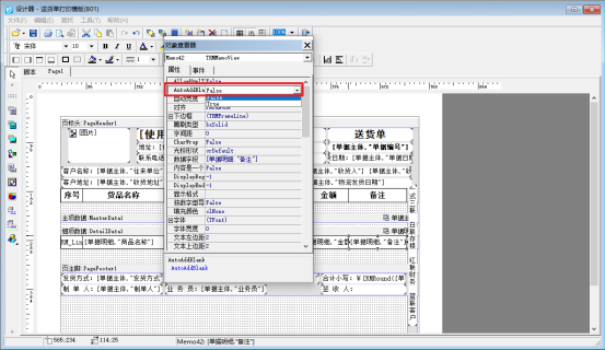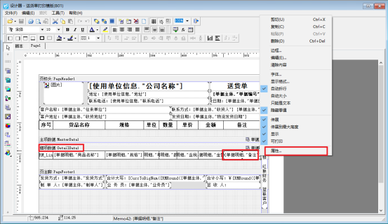 在單據開單界面選擇打印—》打印格式設計—》設計格式,進入打印模板的設計器界面,選中備注項細項數據對應的文本框,右鍵點擊屬性,如下圖所示: