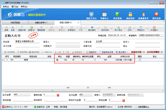 提高操作效率:在采購進貨、銷售出庫以及庫存管理等環節,我們經常需要用到不同的計量單位。有了輔助單位功能,我們無需手動進行單位換算,軟件會自動完成,大大提高了我們的操作效率。如下圖所示,啤酒采購入庫240瓶(輔助單位數量:20打)。
