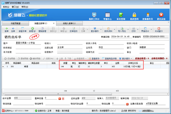 減少誤差:手動進行單位換算,很容易出錯。而進銷存軟件的輔助單位功能,通過預設的換算關系,能夠準確地進行單位轉換,有效減少誤差。如下圖所示,啤酒銷售出庫144瓶(輔助單位數量12打)。