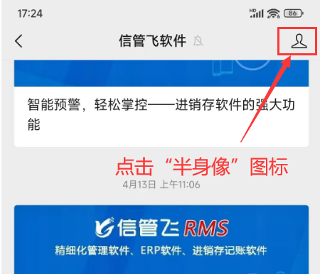 打開“信管飛軟件”公眾號,然后在右上角找到“半身像”名片標識,如下圖: