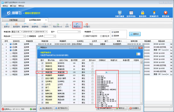 出現以上問題的原因是:打開送貨明細對賬單界面后,直接打開“界面設計”功能配置單據日期格式,沒有先“查詢”數據。
