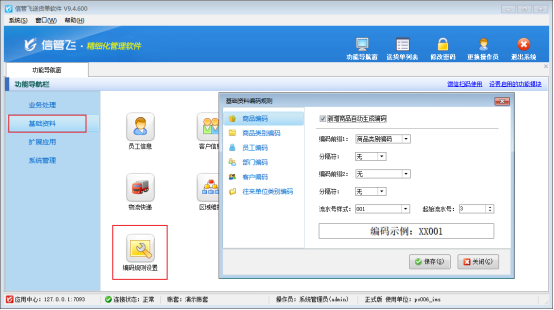 在功能導(dǎo)航窗點“基礎(chǔ)資料”—》“編碼規(guī)則設(shè)置”即可進(jìn)入基礎(chǔ)資料編碼規(guī)則界面,如下圖所示: