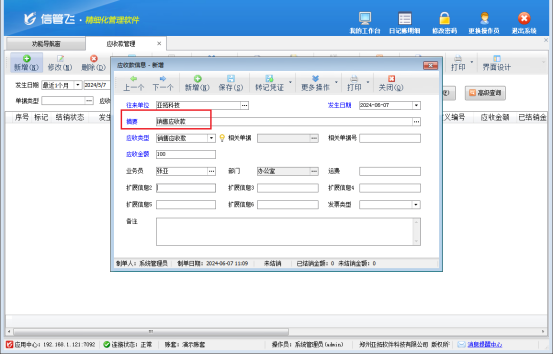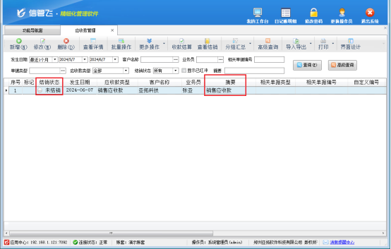 功能導(dǎo)航欄點(diǎn)往來(lái)管理-》應(yīng)收款管理,新增一個(gè)應(yīng)收款,摘要可根據(jù)實(shí)際需求自行進(jìn)行錄入,信息錄入完成后點(diǎn)擊保存按鈕進(jìn)行保存,保存后,應(yīng)收款管理界面增加一條未結(jié)銷的銷售應(yīng)收款記錄。