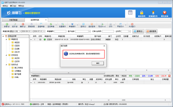 信管飛送貨單軟件通過狀態(tài)控制實(shí)現(xiàn)簡單的流程管理(待簽回—》已簽回—》已結(jié)賬),有用戶在過賬單據(jù)時(shí),系統(tǒng)彈出提示信息“您沒有過賬單據(jù)的權(quán)限,請(qǐng)與系統(tǒng)管理員聯(lián)系!”,如下圖所示。