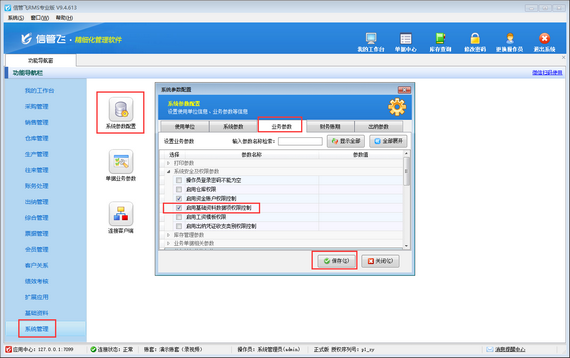 首先需要啟用基礎資料數據項權限控制參數,在功能導航窗點擊“系統管理”—》“系統參數配置”—》“業務參數”打開業務參數配置界面,然后在系統安全及權限參數內勾選啟用“啟用基礎資料數據項權限控制”參數,然后點擊“保存”按鈕保存參數配置,如下圖所示。