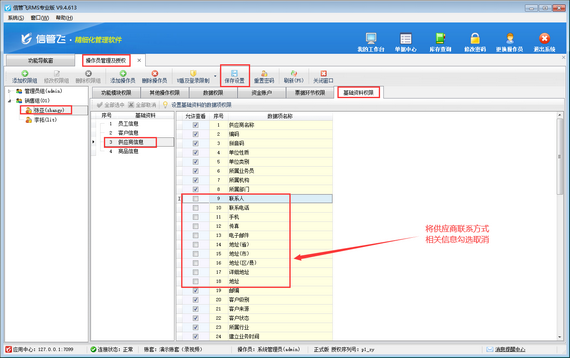參數設置完成后,用系統管理員賬號,在功能導航窗點擊“系統管理”—》“操作員及授權”打開操作員管理及授權界面,選擇操作員賬號,然后在“基礎資料權限”界面將供應商聯系方式相關信息勾選取消,如下圖所示。