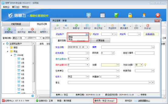 信管飛RMS軟件信管飛出納記賬軟件等支持新增操作員并設置操作員權限,新增資金賬戶后,操作員登錄軟件后新增日記賬看不到新增的資金賬戶,如下圖所示,如何解決?