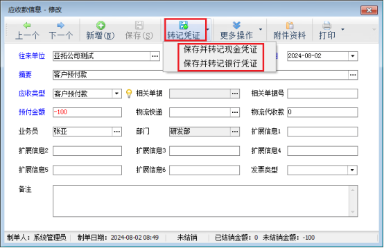 信管飛軟件新增客戶預(yù)付款界面如何直接轉(zhuǎn)記出納憑證?