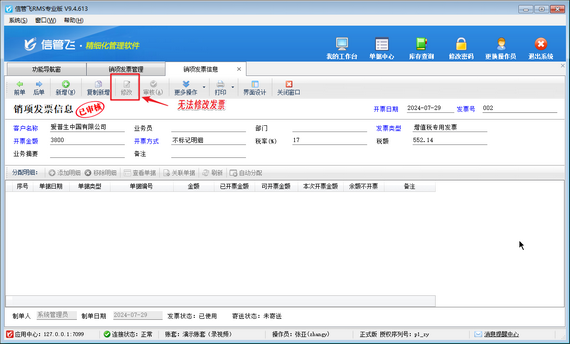 發票管理模塊是屬于擴展模塊,只有在信管飛RMS標準版和專業版中才能使用。有用戶在使用發票管理模塊過程中,無法修改進/銷項發票,如下圖所示。