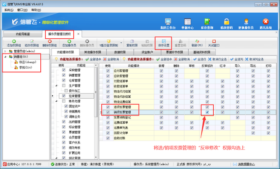 出現以上問題的原因是:操作員賬號沒有反審修改發票的權限。解決方法如下:使用系統管理員賬號登錄軟件,在功能導航窗點擊“系統管理”—》“操作員及授權”打開“操作員管理及授權”界面,選擇操作員賬號,在功能模塊權限內選擇“往來管理”模塊,將進/銷項發票管理的“反審修改”權限勾選上,然后保存權限設置,如下圖所示。