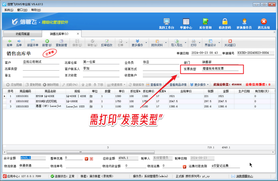 信管飛RMS支持開銷售單界面選擇發(fā)票類型,可以根據(jù)實際需要選擇不同的開發(fā)票方式,如下圖所示。