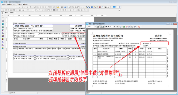 打印送貨單時同樣需要打印“發(fā)票類型”,但是在設(shè)計模板時直接調(diào)用[單據(jù)主體."發(fā)票類型"]數(shù)據(jù)項,打印預(yù)覽送貨單時,發(fā)票類型會顯示為數(shù)字,而不是文字內(nèi)容,如下圖所示。