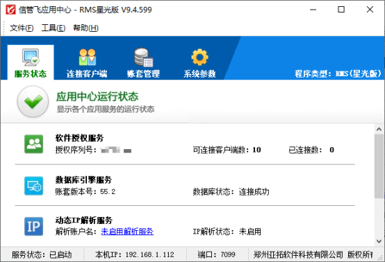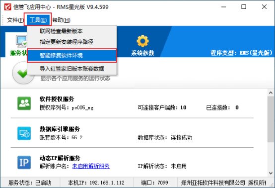 智能修復軟件環境完成后,請重啟應用中心程序,然后查看下數據庫連接狀態是否顯示為連接成功(如下圖所示),數據庫狀態為連接成功,則軟件即可正常登錄。