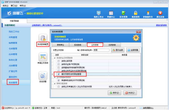 參數設置在功能導航窗點擊“系統管理”,“系統參數配置”,參數配置界面選擇“業務參數”,勾選啟用參數“操作員授權按權限組管理”,保存參數配置,如下圖所示: