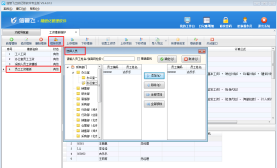 支持軟件啟用工資模板權限,在工資模板維護界面支持設置每個模板的可查看人員,選擇后使用操作員登錄在工資模板維護界面僅顯示允許自己查看的工資模板。