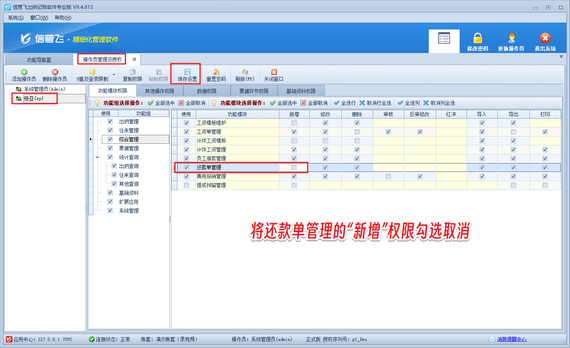 首先使用系統(tǒng)管理員賬號(hào)登錄軟件,在功能導(dǎo)航窗點(diǎn)擊“系統(tǒng)管理”—》“操作員及授權(quán)”打開操作員管理及授權(quán)界面,選擇操作員賬號(hào)“張亞”,在右側(cè)的功能模塊權(quán)限內(nèi),選擇綜合管理模塊,將還款單管理的“新增”權(quán)限勾選取消,然后保存權(quán)限設(shè)置,如下圖所示。